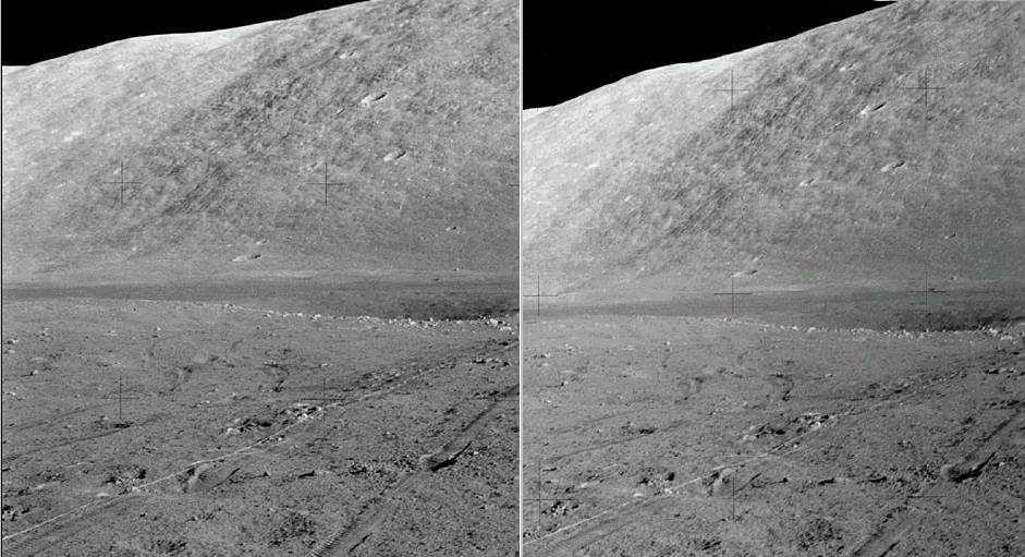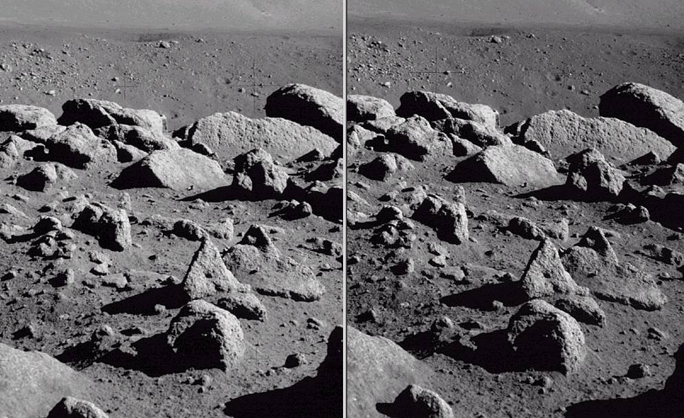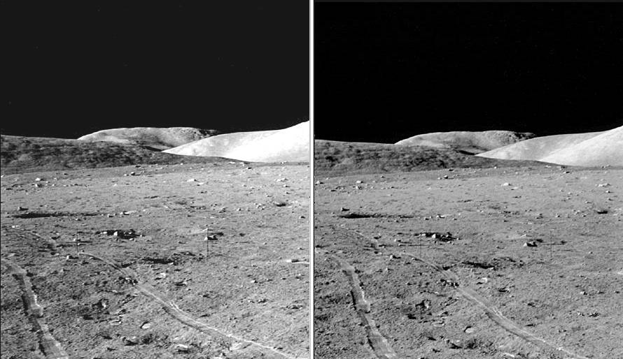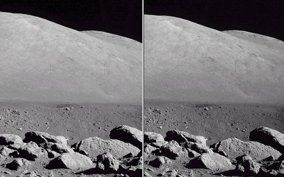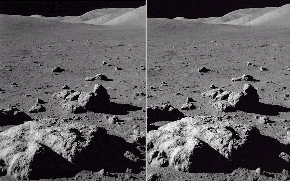 Imagens do projeto Apollo reprocessadas. Estas fotos são da missão Apollo 17, a última missão humana na Lua (por enquanto). Nos arquivos das missões Apollo eu encontrei algumas seqüências de fotos panorâmicas. Como as fotos apresentavam uma razoável superposição, aproveitei esta área da foto para montar os pares estereoscópicos. Uma visão que apenas 12 eleitos tiveram agora está ao teu alcance. Observem como o que a primeira vista (2D) parece uma superfície plana se torna bastante ondulada em 3D, o que parece contínuo é quebrado em declives a aclives: