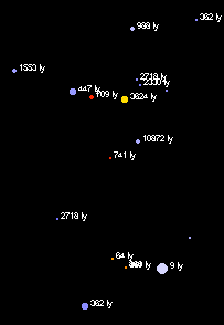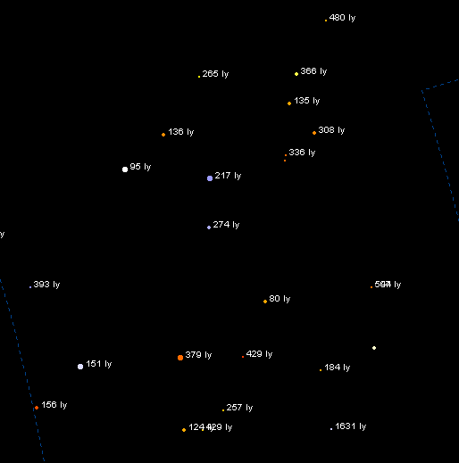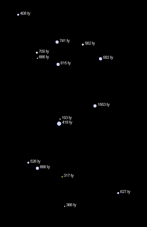 Sagittarius 3D - a figura mostra estrelas até a magnitude 5,0. Veja as distâncias em anos-luz. |