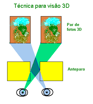 Se você já viu aquelas imagens em 3 dimensões do livro "Olho Mágico", então já sabe usar a técnica da visão em "X" ou "cruzada" para formar as imagens em 3D. Outra técnica muito boa é com o uso de anteparos. Podes usar qualquer coisa como anteparo, duas folhas de papel, dois livros, as mãos, etc. Veja a figura abaixo. O truque é fazer com que o espaço entre anteparos seja apenas o suficiente para que cada olho veja a respectiva imagem (com visão em "X"). Ajuste o espaçamento entre anteparos e a distância para cada olho por vez, repita o processo para que a posição do anteparo permita a observação das duas imagens, cada uma apenas pelo olho correspondente. Neste instante olhe para o anteparo e perceba que no fundo as duas imagens se fundem, basta ajustar o foco dos olhos para as imagens ao fundo e quase com certeza vais ver em 3D.
