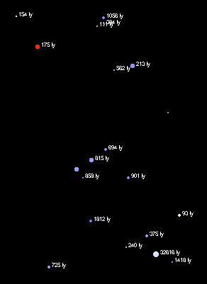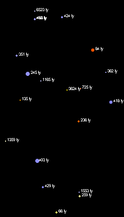 | Scorpius 3D - a figura mostra estrelas até a magnitude 3,5. É interessante notar que nem sempre a estrela de maior brilho é a mais próxima. Repare que as três menores estrelas são as mais próximas de nós. |