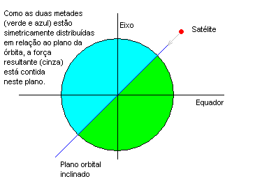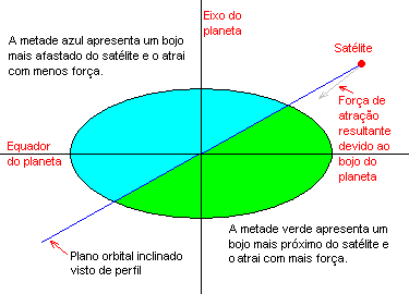 Vejam que o plano orbital (linha azul) do satélite (bolinha vermelha) passa pelo centro do planeta. Isso é óbvio pois quem mantém o satélite em órbita é a atração gravitacional do planeta como um todo e o centro de massa do planeta coincide com seu centro geométrico. Pois bem, para que o satélite se mantenha nesta órbita é necessário que a força atuante nele esteja sempre direcionada para o centro do planeta e no mesmo plano de sua órbita, caso contrário, se existir uma força que atue em outra direção este satélite sairá deste plano orbital e se estabelecerá em outro plano. Agora observe bem que eu dividi o planeta em duas metade de mesma massa usando o próprio plano orbital do satélite. Observe melhor ainda que estas duas metades não estão simetricas em relação ao satélite. Vejam que a metade verde tem um bojo equatorial mais próximo do satélite que o bojo da metade azul que está lá do outro lado. Isso faz com que a força gravitacional resultante seja direcionada um pouco mais na direção do bojo próximo, o verde, e esta força tende a tirar o satélite do seu plano orbital original. Se fizéssemos o desenho para outras órbitas inclinadas ainda teríamos esta força gravitacional levemente para fora do plano. O único lugar onde esta força resultante não apontaria para fora do plano da órbita é quando o plano estiver exatamente no plano equatorial pois aí teremos duas metades exatamente iguais e simétricas. Conclusão: qualquer satélite, ou lua, ou pedregulho, ou grão de poeira que esteja numa órbita inclinada próxima de Saturno tenderá a ir para o plano equatorial do planeta. E é isso que acontece com os seus anéis, eles estão espremidos no plano equatorial devido ao formato achatado do planeta. O mesmo acontece com a as luas próximas de Saturno, estão todas orbitando praticamente no plano equatorial. Na verdade existe outro plano orbital onde poderia haver um equilíbrio instável, são as órbitas polares. Se desenhássemos uma órbita polar ela dividiria o planeta em duas metades simétricas também porém qualquer pequeno desequilíbrio nesta órbita e começaríamos a ter a força inclinada atuando e carregando o satélite para o plano equatorial.