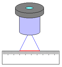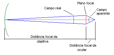 Este é o campo de visão aparente da ocular. Para calcular o campo de visão real, a porção do céu que será observada temos que saber a distância focal da objetiva. O campo de visão real é o mesmo ângulo sob o qual o campo em milímetro de uma determinada ocular é visto de uma distância igual a distância focal da objetiva. Complicou? Veja o desenho abaixo: