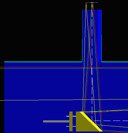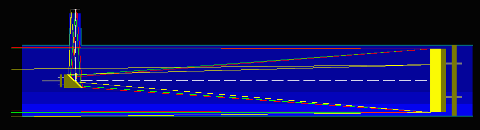 ![]() A explicação do item 1.3 é um pouquinho mais complicada. Quando eu calculei pela primeira vez a montagem do meu telescópio eu pensava que bastava desenhar o cone central dos raios de luz (linhas verdes) e colocar o secundário numa posição tal que estas linhas verdes tocassem no secundário exatamente nas suas bordas. Com isso eu cometi o erro de ter no plano de foco 100% de luminosidade apenas do astro que estivesse exatamente alinhado com o eixo ótico do meu telescópio. Na verdade para obter a máxima luminosidade de todo o campo é necessário colocar o secundário mais afastado do primário, assim ele interceptaria o cone de luz do primário num ponto onde ele seria mais estreito e portanto englobaria também os raios de luz amarelos (ou então usar um secundário de maior diâmetro, o que implica em maior perda de luminosidade por obstrução da abertura do telescópio). Mas se assim o fizer (afastar o secundário do primário) estarei diminuindo o comprimento restante do cone de luz que deverá ser desviado a 90° para fora do tubo e o plano de foco do primário ficará posicionado muito para dentro do focalizador sendo até impossível de alcançar com a ocular. Portanto o posicionamento do secundário é um compromisso entre querer máxima luminosidade e conseguir colocar o plano de foco do primário ao alcance das oculares. Na prática o que pode ser feito é medir a distância focal da menor ocular (a partir do "ombro" da ocular que se apoia no tubo do focalizador) conforme descrito acima (usando uma régua agora na perpendicular ao pedaço de jornal usado para focar). Depois abrindo o focalizador cerca de meio cm (5 mm) para dar uma folga, descontamos a medida anterior (da ocular) e marcamos na lateral do focalizador qual será a posição do plano focal desejado. Então medimos esta distância até a lateral do tubo do telescópio mais o raio do tubo (incluindo a sua espessura) e subtraímos tudo da distância focal do espelho primário. O resultado será a distância máxima permitida do primário até o centro da superfície espelhada do secundário. Finalmente, qual seria o diâmetro interno do tubo para que não haja vinhetagem na borda do mesmo?