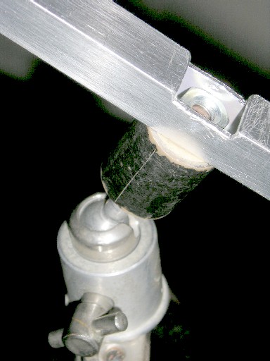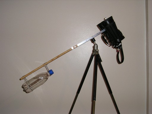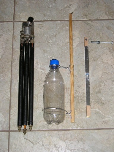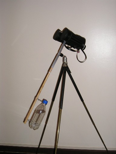 As imagens abaixo são autoexplicativas. Fiz um suporte para meu binóculo 10x50 com um pedaço de perfil de alumínio, um pedaço de madeira retirado de um cabide, um parafuso e porcas e uma garrafa PET de 500 ml. Usei um velho tripé para máquina fotográfica, não é muito firme mas evitando esbarrões o conjunto deixa o binóculo absolutamente parado, como uma luneta. Ele possui uma pequena junta tipo bola que permite girar a Zeringonça para todos os lados. A observação deve ser feita preferencialmente sentado numa cadeirinha de praia baixa e reclinável. Sentando na cadeira na posição adequada para observar uma determinada região do céu, colocamos duas pernas do tripé passando rente às nossas costelas e a terceirta perna para a frente, entre as nossas pernas. Ajustamos o comprimento das pernas do tripé até que as oculares do bino se aproximem dos nossos olhos e podemos observar qualquer região do céu com todo conformo com a cabeça recostada no encosto da cadeira. O ganho na qualidade da observação é muito grande, eu estimo que ganhamos mais de uma magnitude.