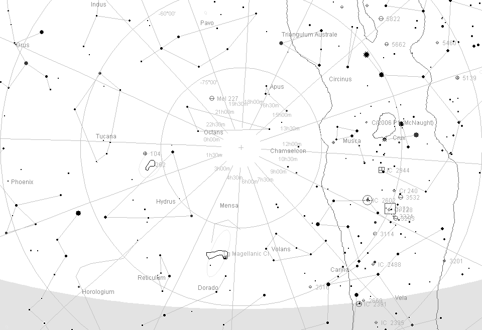 Os globulares são grandes concentrações de estrelas com formato esférico e um pouco difuso nas bordas. São objetos bastante antigos com estrelas amarelas e vermelhas e estão em órbita do centro da galáxia em diversos planos formando um enxame esférico que cruza o disco galáctico. Ainda podemos ver o aglomerado globular de Omega Centauro - também conhecido como NGC 5139 - um pouquinho ao norte do Cruzeiro.