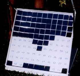 2 - Para centrar bem direito cada espelho usando o método descrito acima eu coloquei um papel cobrindo o suporte de alumínio com um furinho bem no centro. Observando pelo furinho teremos que ver o reflexo do número na cartolina fixada no teto bem centrado no espelho que estamos colando. Esta centragem não é tão crítica pois o objetivo seria aquecer, por exemplo, água em uma pequena chaleira. Então podemos admitir um erro de meio a um cemtímetro no foco de cada espelho pois ainda assim teremos a soma de todo espelhos na região central do foco.
