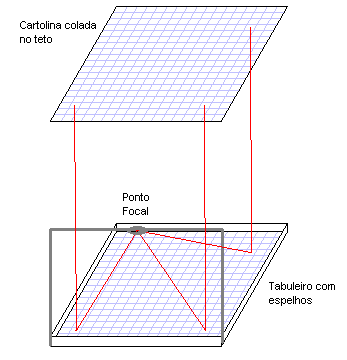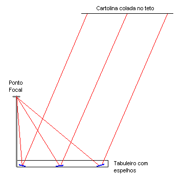 1 - Eu projetei o fogão solar para que o ponto focal ficasse num ponto acima da borda da caixa pois assim o objeto que fosse colocado no suporte não faria sombra em nenhum espelho, o que reduziria a eficiência do fogão. Com isso o espelho de referência que foi colado sem inclinação nenhuma, plano no fundo da caixa foi o do centro da segunda fileira a partir do suporte de alumínio, os demais espelhos devem convergir para o mesmo ponto que este primeiro espelho ilumina no ponto focal.