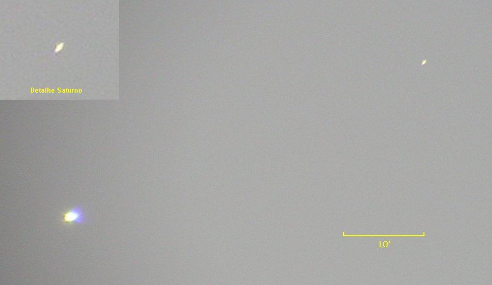 Saturno no alto, Vênus no meio, Mercúrio bem baixo e Pollux a direita próximo da antena.