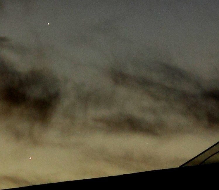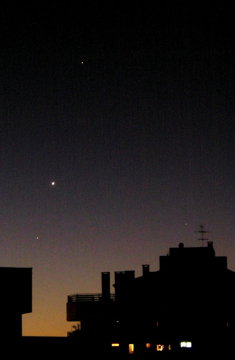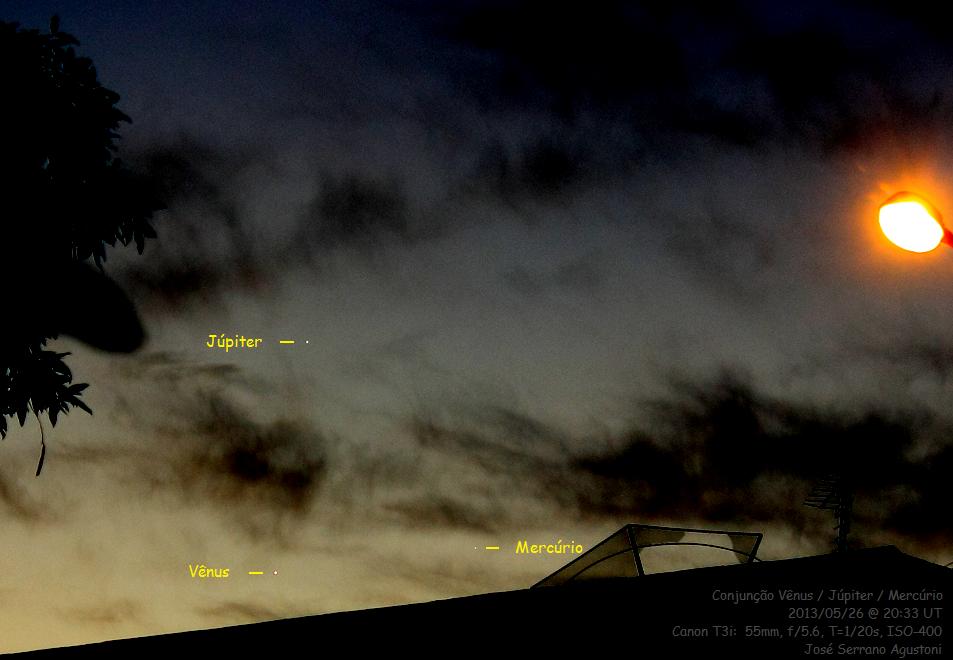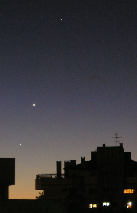 Retirei brilho e aumentei o contraste para realçar os planetas, principalmente Mercúrio, contra o céu ainda claro do crepúsculo. A rigor eu só fui saber que havia capturado Mercúrio depois do processamento das imagens. Na hora do registro, a claridade impedia sua visão.