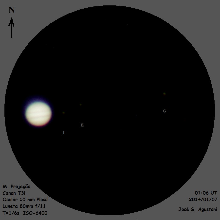 Consultando a revista "Sky & Telescope" de novembro/2001, verifiquei que no dia 12/nov/01 às 01:29 (hora local) a lua Europa de Júpiter seria eclipsada pela sombra do gigantesco planeta (veja tabela). Exatamente no horário comecei a perceber a diminuição da luminosidade de Europa. O fenômeno é bastane rápido pois Europa leva apenas três dias e meio para completar uma órbita e em cerca de dois minutos pude observar o escurecimento total do disco desta lua.