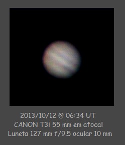 Com webcam Logitech em foco direto no telescópio 180 mm, f/7, filtro laranja. Fotos registradas com K3CCDTools e tratadas com Registax, ampliadas 4x. |