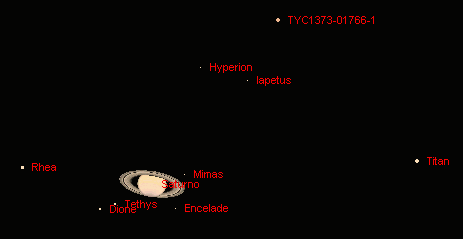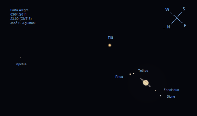 Consegui ver pela primeira vez 6 luas de Saturno (até hoje só havia observado 5 luas), a "caçulinha" foi Iapetus, que está em boa posição para ser observada, com seu lado branco voltado para nós (o que acontece quando Iapetus está a oeste de Saturno). Abaixo as magnitudes (do Stellarium) e o grau de dificuldade para observá-las. Vejam que Iapetus foi mais fácil de observar que Dione pois esta última estava bem perto do brilho ofuscante de Saturno (talvez também exista um erro das mag. do Stellarium).Diagrama para observar Iapetus