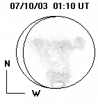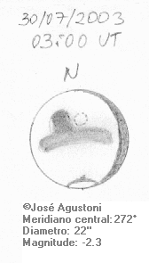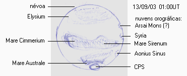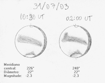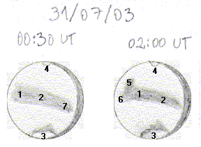 | Dados: Detalhes: Data: 31/07/03 1 - Mare Tyrrhenum Hora: 00:30 02:00 UT 2 - Mare Cimmerium Mer. central: 226° 248° 3 - Calota polar sul Diâmetro: 22" 22" 4 - ponto branco (?) Magnitude: -2,3 -2,3 5 - Syrtis Major 6 - Mare Serpentis 7 - Mare Sirenum |