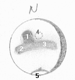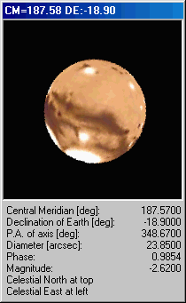 Dados: Detalhes: Data:20/07/03 1 - Sinus Sabaeus Hora: 05:30 UT 2 - Argyre I Meridiano central: 40° 3 - Mare Erythraeum Diâmetro: 20' 4 - Vulcani Pelagus Magnitude: -1,98 5 - Bosporos Gemmatus 6 - Nuvens próximas à calota polar norte |