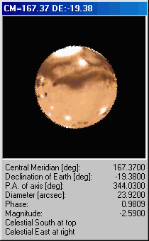 Observação de Marte com telescópio 180 mm, diafragmado para f/30 (um orifício de 40 mm), oculares de 15 mm e 5 mm ortho, com filtro laranja. Observados Mares Serpentis e Tyrrhenum formando um arco paralelo ao equador sem tocar no terminador nem no limbo de Marte, Syrtis Major se sobressaindo mais ao norte, calota polar sul com borda escura, mancha clara visível com dificuldade ao oeste de Syrtis M. identificada como Libya.Condições da observação: céu com névoa fraca, brisa leve (14 km/h) do oeste, temperatura 16°C, nuvens se aproximando do oeste, observação encerrada às 03:08 UT.