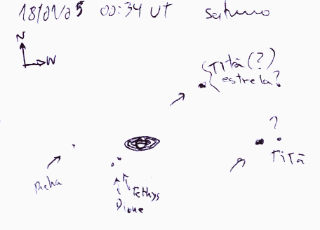 Sketch de observação de Saturno e suas luas. A presença de uma estrela alaranjada causou confusão com a lua Titã.